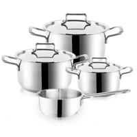 Konyhai edények rozsdamentes acél és üveg fedővel, masszív vízálló fogantyúkkal, háromrétegű szendvics aljjal és mérőskálával. Első osztályú rozsdamentes acélból készült 18/10, minden típusú tűzhelyre alkalmas - gáz, elektromos, üvegkerámia és indukciós, mosogatógépben is mosható. 5 év garancia. A készlet tartalma: · fazék fedővel 6.0 l, ø 24 cm · lábas fedővel 3.0 l, ø 20 cm · lábas fedővel 2.5 l, ø 18 cm · lábas fedővel 1.5 l, ø 16 cm · nyeles lábas fedővel 1.0 l, ø 14 cm